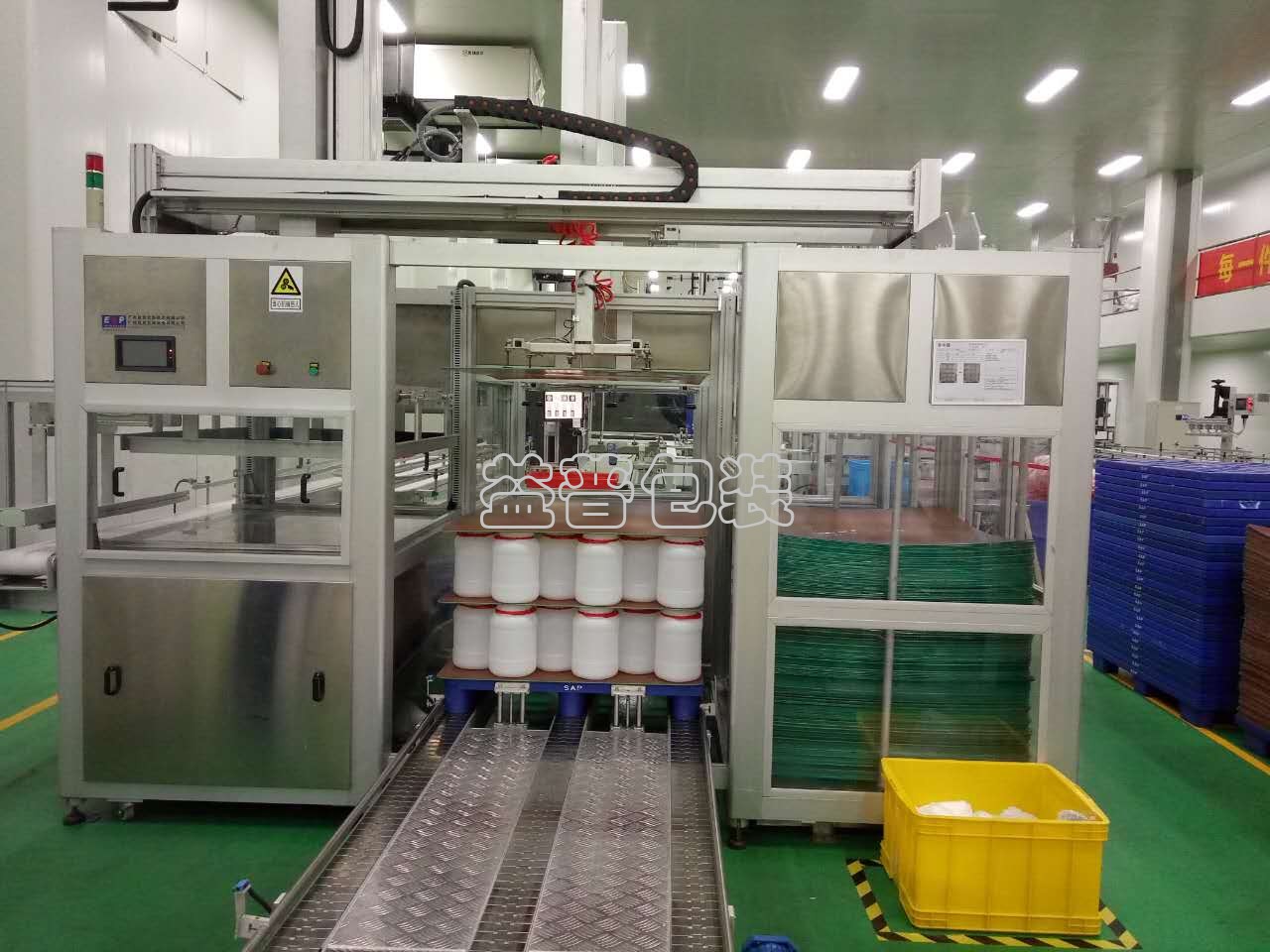 工作時,塑料瓶通過進瓶輸送線進入碼垛機,按照一定排列順序進瓶,當達到預設每一層空瓶數量時,移載裝置將整層瓶子平移到垛板上,隔板供給裝置從隔板倉中取出隔板放置在碼垛工位,然后繼續下一層,重復上述動作,當達到預設層數時,通過輸送鏈自動將滿垛產品輸送。